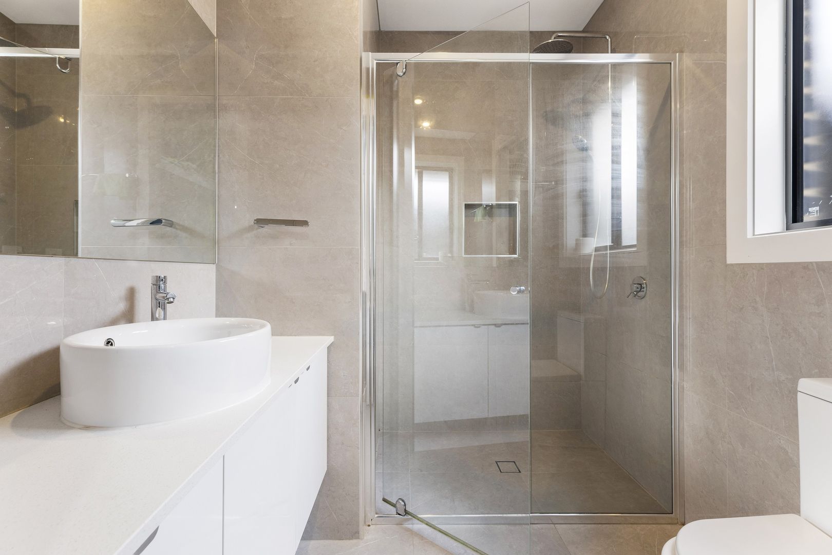 Main bathroom with floor-to-ceiling porcelain tiles